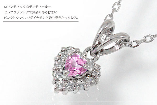 【素材】ペンダント/プラチナ900 ネックレス/シルバー925(アズキ 約40cm) 【宝石】ピンクトルマリン(ハート 約 3.0mm/天然石使用) ダイヤモンド 11石 (合計 0.10ct) 【サイズ】最大幅 縦約11.7mm(バチカン込)横約6.0mm 【備考】価格を抑えるために、シルバーネックレスをサービスでお付けしています。