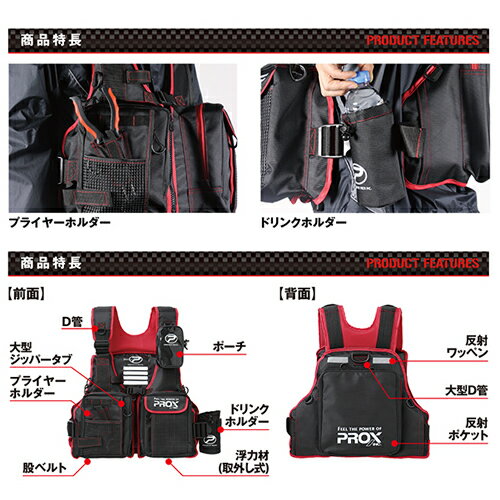 フローティングゲームベスト PX399 大人用フリー■サイズ:大人用フリー■ウェスト対応目安:100〜150cm■浮力:7.5kg■国土交通省型式承認品と同等の浮力(型式承認品ではありません)■表地:ポリエステル■裏地:ポリエステル■浮力材:発泡ポリエチレン≪プロックス ゲームベスト≫●多機能なフローティングゲームベスト。